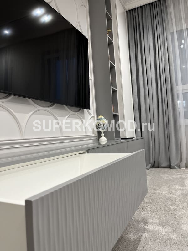 Гостиная в современном стиле с классическими элементами отделки на стенах. Длинная подвесная тумба под ТВ с ребристыми выдвижными ящиками. Пенал с открытыми полками. Круглый обеденный стол в комплекте с серо-голубыми стульями с велюровой обивкой. Серый раскладной угловой диван. Освещение над столом — кольцевая люстра. Трековые светильники над зоной отдыха. Двери раздвижные с зеркальной поверхностью и узорами. Скрытые межкомнатные двери. Зеркало и пуф со стороны прихожей.