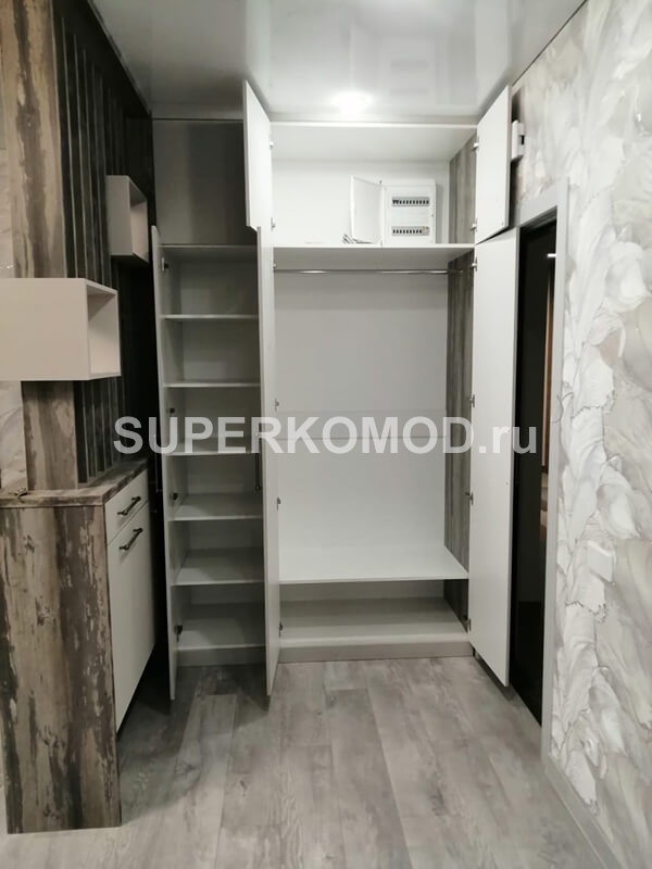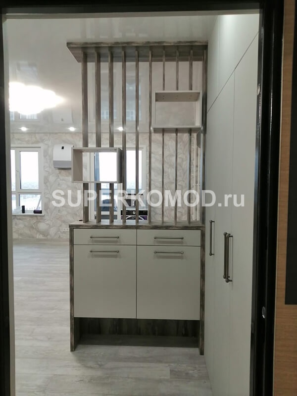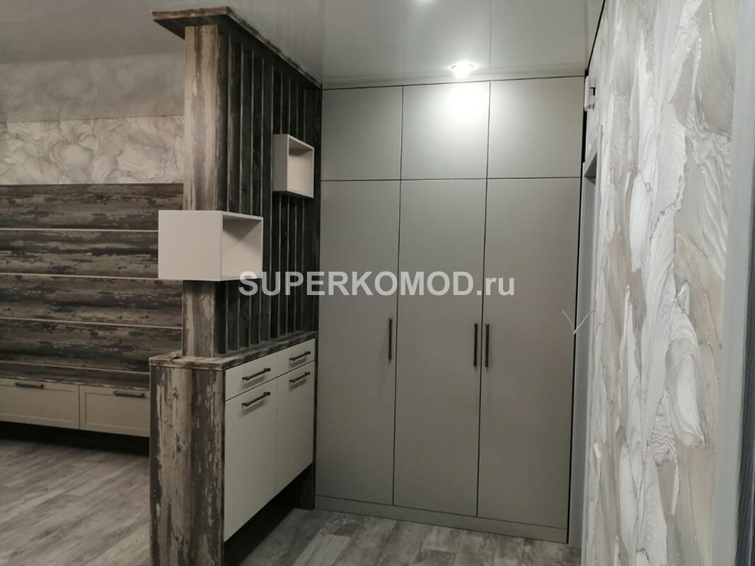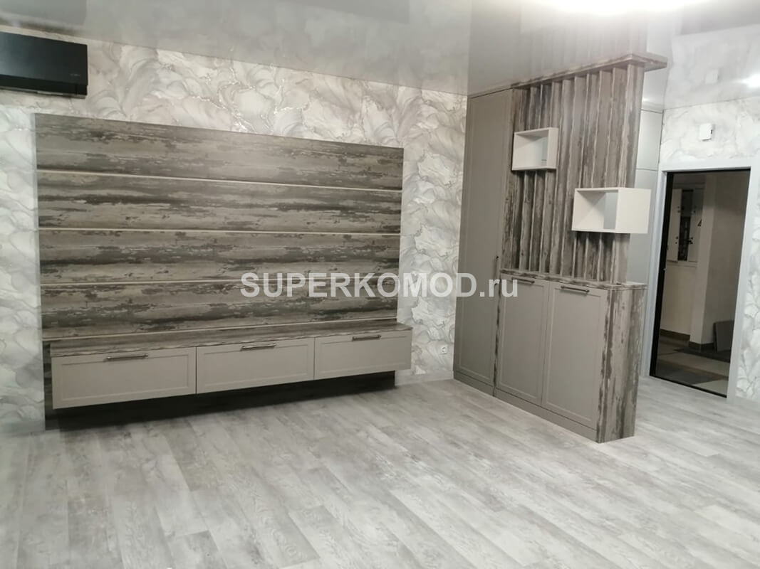 Большая гостиная, в которой зонирование с прихожей выполнено мебелью. Большая тумба под телевизор с тремя отделениями. Над тумбой панель с имитацией дерева. Перегородка объединена с шкафами, есть две открытые полки бежевого цвета. В зоне прихожей обувница и встроенный большой шкаф для одежды. Фасады натуральных природных оттенков, есть матовые поверхности и с фрезеровкой.
