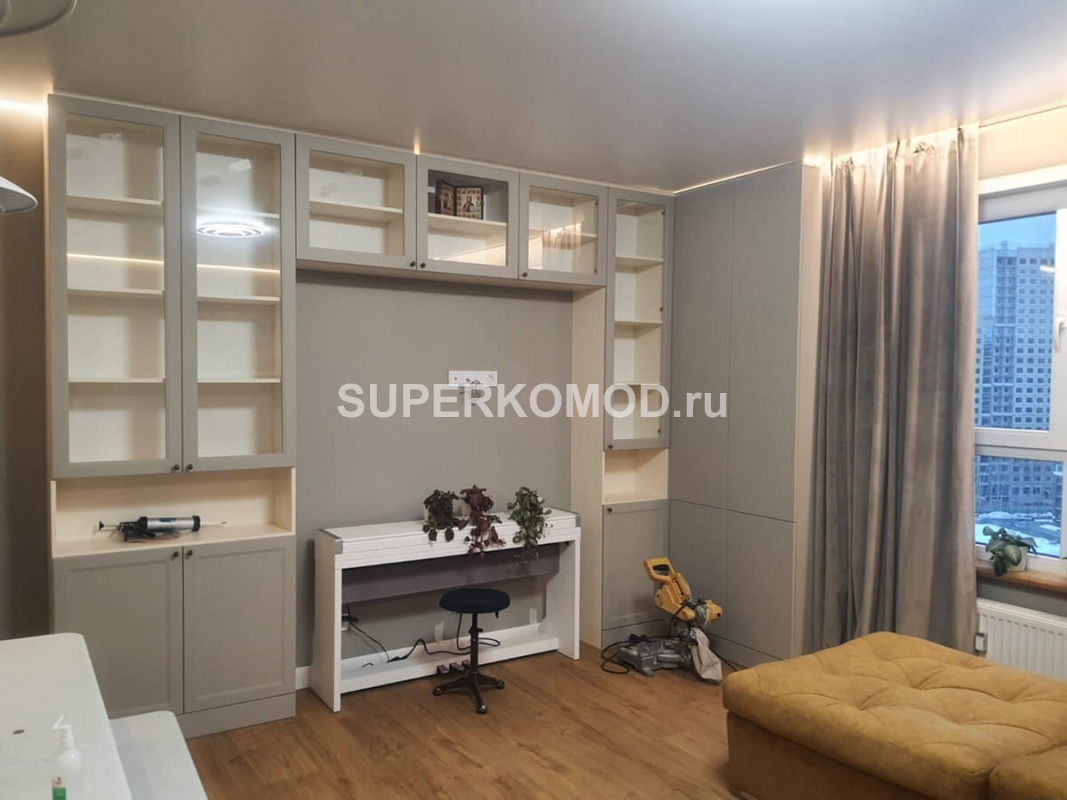 Светлая гостиная в современном стиле. Серые стеновые панели с полками и встроеннми шкафами. Есть ниша под музыкальный инструмент. По обе стороны от окна есть скрытые панели с полками с дверцами без ручек. Основные стеллажи с прозрачными стеклянными дверцами с ручками кнопками. Нижние полки с непрозрачными дверцами. Диван угловой. Стол с детскими стульями. Есть стеллажи с открытыми полками. Потолок с периметральной led-подсветкой и центральным светильником с мягким рассеянным светом. Пол — под натуральное дерево. Кондиционер.