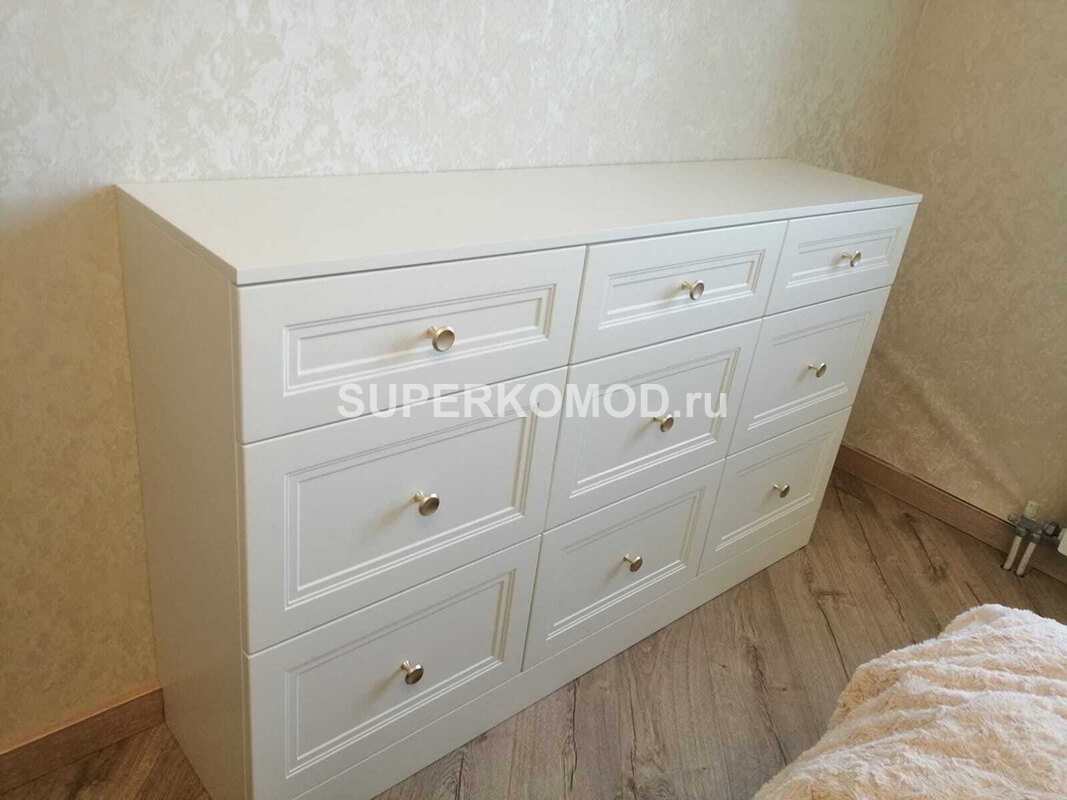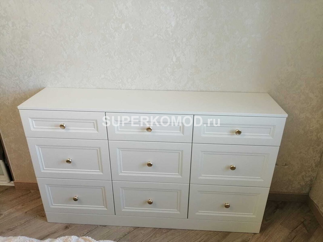 Комод в классическом стиле белого цвета, фасады с фрезеровкой и ручками кнопками. Девять выдвижных ящиков.
