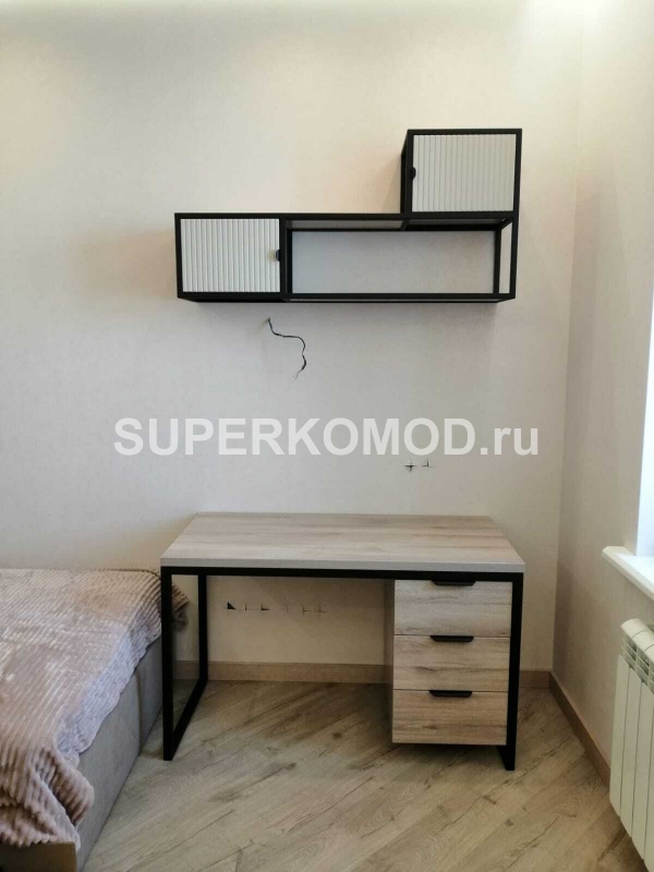 №1: компьютерный стол прямой с тремя выдвижными ящиками с правой стороны, над столом навесная полка с открытой и закрытыми секциями.