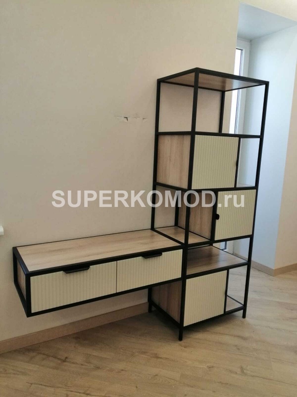 №2: компьютерный стол прямой, с двумя выдвижными ящиками, боковым стеллажом с открытыми и закрытыми полками.