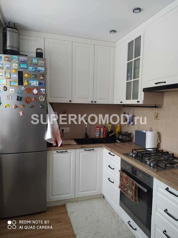 Белые фасады с фрезеровкой. Ручки-скобы на нижних фасадах и ручки-кнопки на верхних. Открытые полки. Декоративная стеклянная вставка. Столешница ДСП и раковина из керамогранита. Встроенная плита, духовой шкаф и вытяжка. Фартук из плитки. Планировка кухни — угловая.