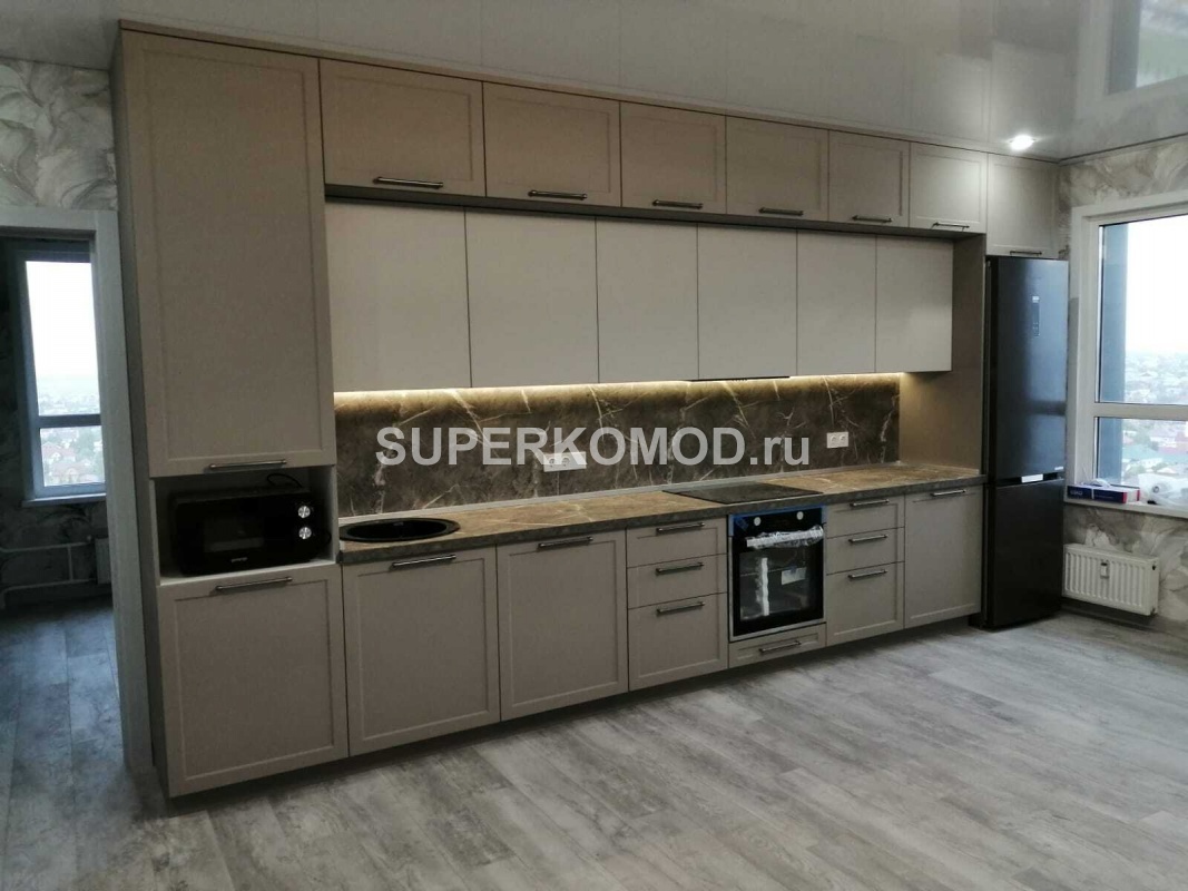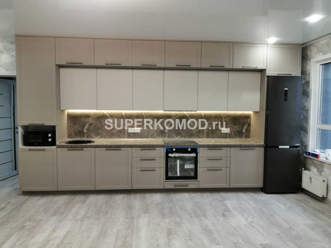 Кухня в потолок с большой рабочей поверхностью в цвете «Кофе с молоком», верхние фасады молочного цвета. Фасады матовые с фрезеровкой и большими ручками-скобами. Столешница и фартук с отделкой под камень, раковина из керамогранита. Два вывода для розеток, встроенная техника, подсветка.