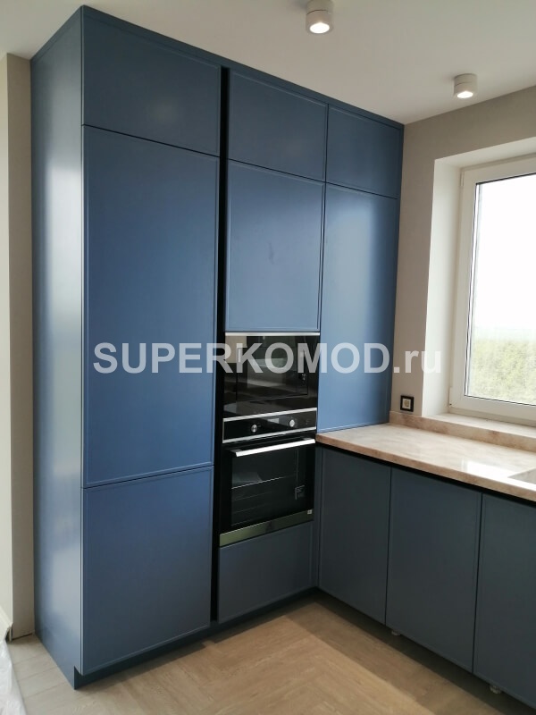 Кухонный гарнитур п-образной формы в синем цвете со столешницей из искусственного камня. Встроенная раковина, плита и духовой шкаф. Встроены ящики и полки, имеются антресоли.