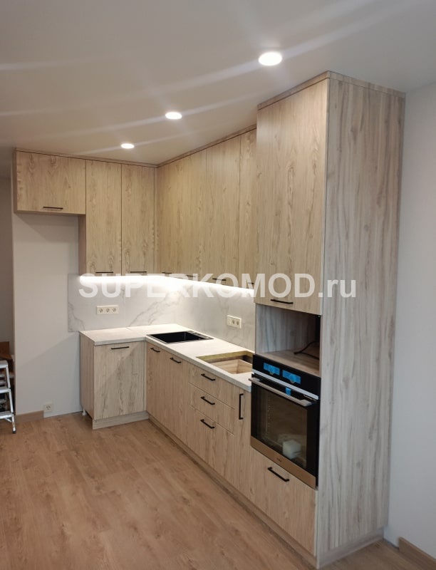 Угловая кухня с ручками скоба. Есть подсветка. Фасады цвета дерева. Встроенная техника.
