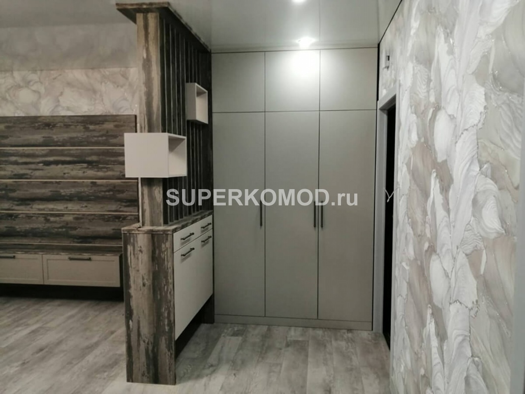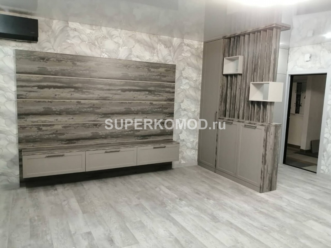 Комплекс мебели выполнен в единой цветовой гамме — серо-бежевые фасады с матовым покрытием в сочетании с панелями под состаренное дерево. Прихожая отделена от гостиной перегородкой со встроенной мебелью: функциональный блок со шкафом для хранения/обувницей и декоративной перегородкой, объединённой с тумбой и открытыми навесными полками в контрастном цвете и отделкой под дерево. В зоне прихожей — встроенный серый шкаф с гладкими фасадами и длинными ручками.