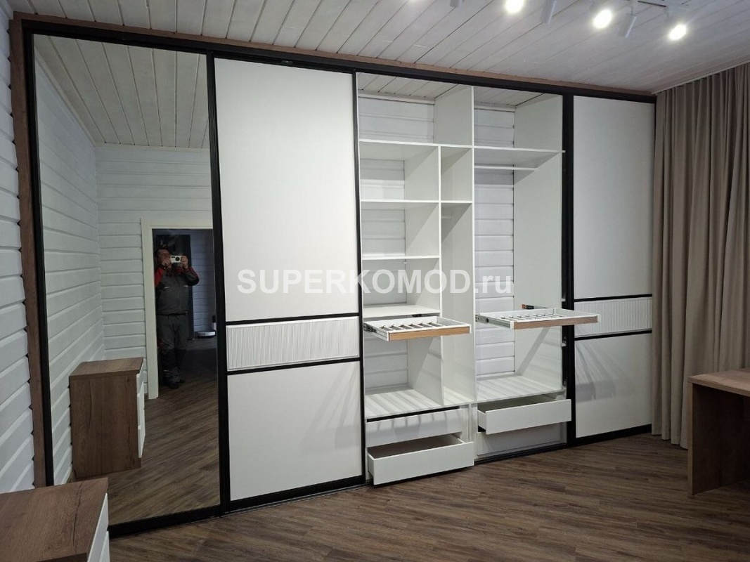 Вместительный шкаф-купе в спальню. Есть полки и штанга под одежду. Фасады матовые светлые.