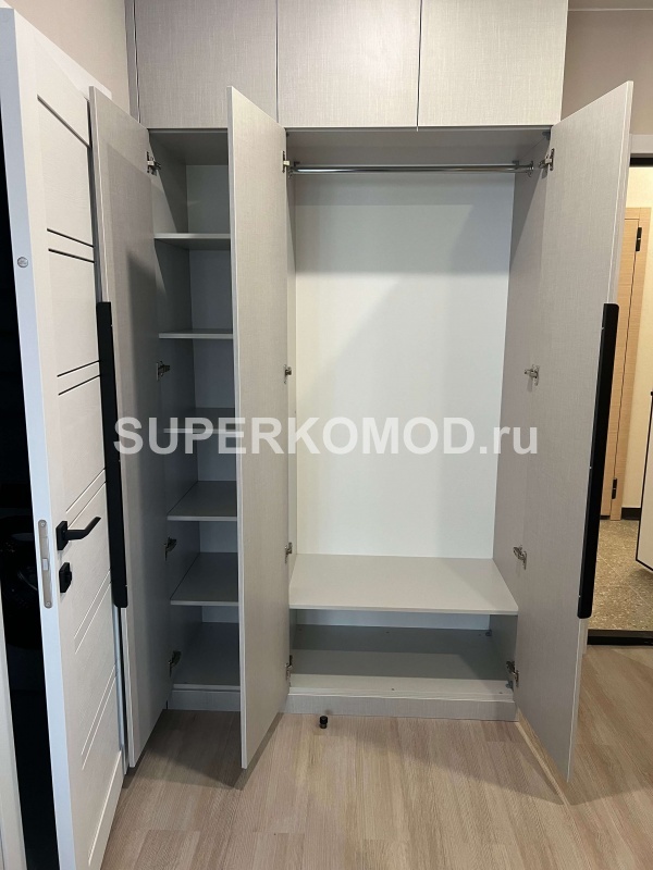 Распашной встроенный шкаф серого цвета. Идеально подходит для хранения одежды, обуви и аксессуаров, а также для экономии пространства в прихожей. Шкаф имеет прочную конструкцию, которая обеспечивает надёжность и долговечность изделия.
