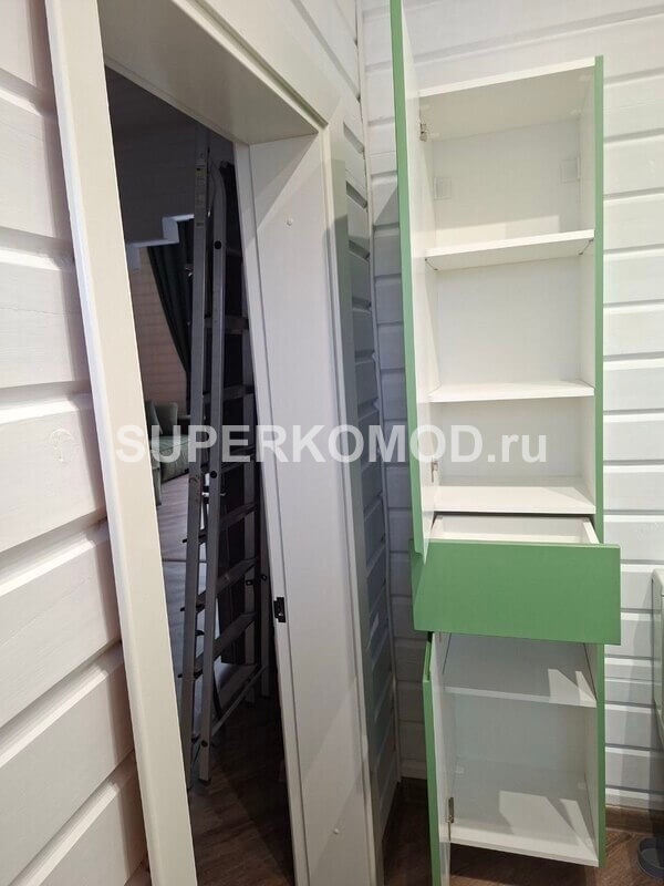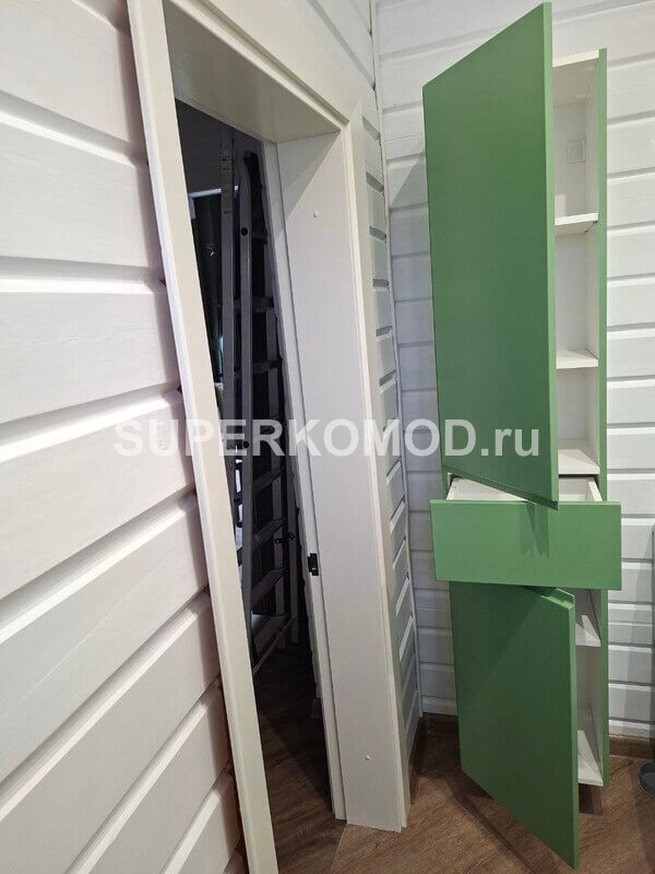 Подвесной шкаф в ванную комнату в зеленом цвете с интегрированными ручками.
