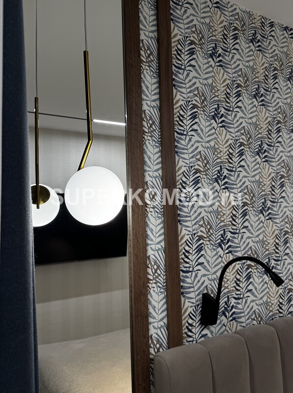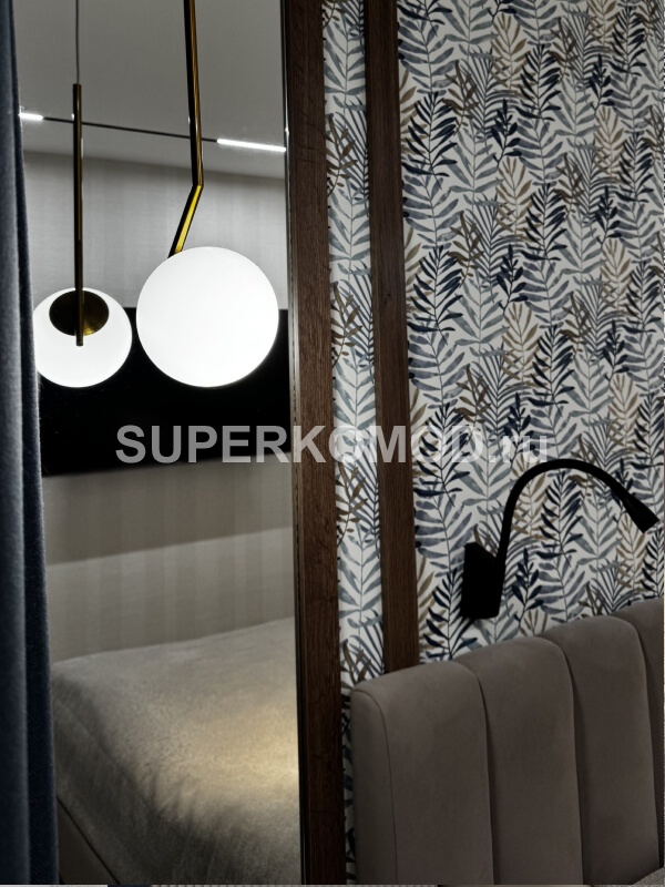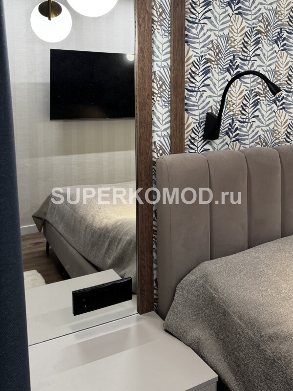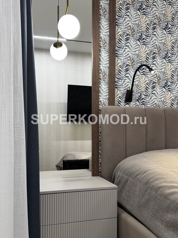 Спальня в современном стиле: кровать с мягким изголовьем, светлая тумба, большое зеркало и настенный светильник.